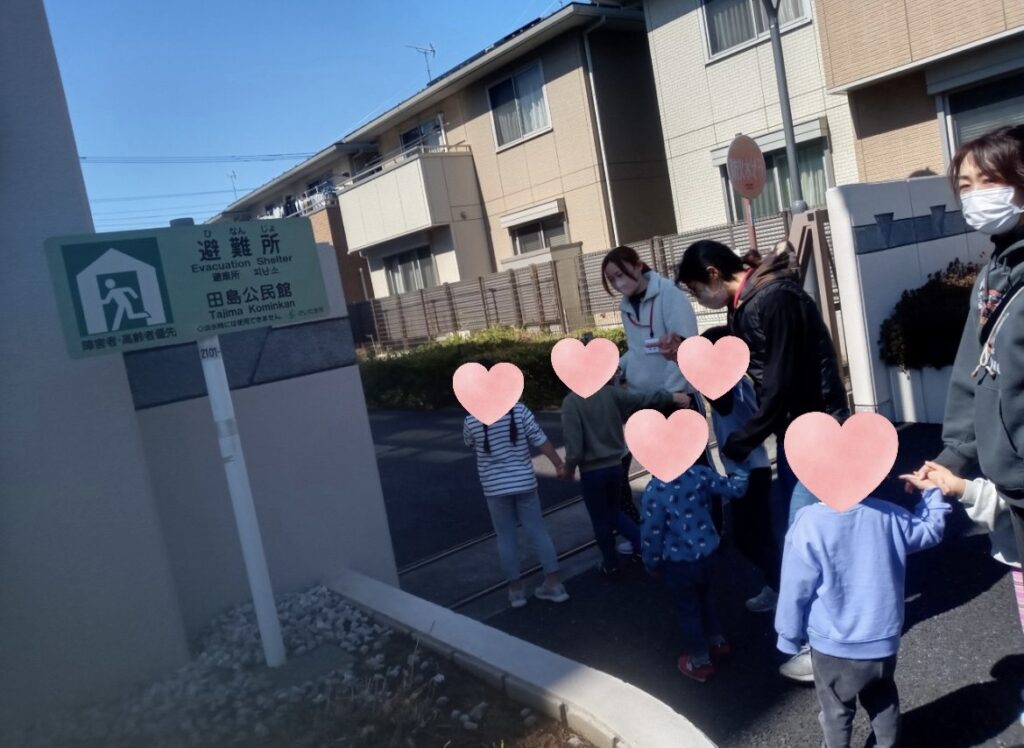 また、大きな地震が起こった場合を想定し、子どもたちの人数確認を行った後、近くの避難場所である【田島公民館】まで速やかに移動しました。