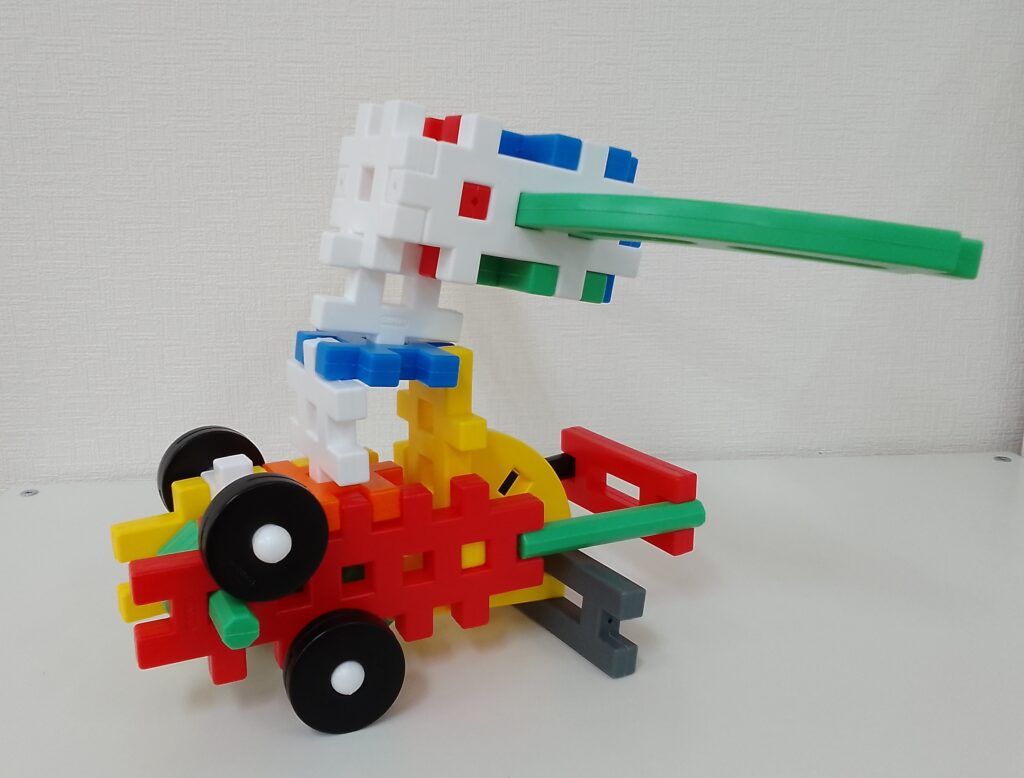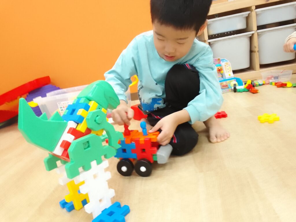 「ここは弓を持つところ」、「ここは掃除機でごみを吸い取るところ」等、沢山お話してくれる姿や恐竜に足をつけたり、車に人を乗せたりと工夫しながら楽しんで作っていました!